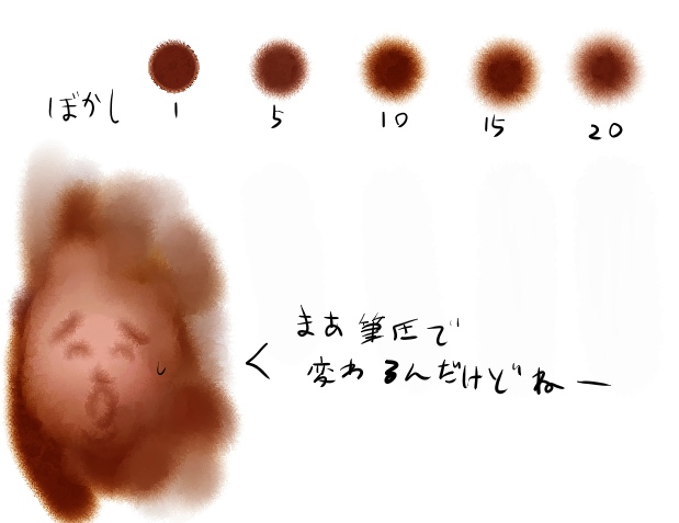 さて、デジタル水彩ですがこれは結構な人が使ってるのではないでしょか。オールラウンダーに使えるアナログ感感じるブラシれす。このブラシで普通に塗っちゃう人が大体な気がします。まず特徴はアナログ的なぼかしですね。ぼかし数値別でまとめてみたけどぜんぜん活用しないと思います^^;まさにペインターにしかないブラシ機能。